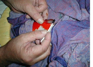 Minor damage can be dealt with without sedation. However, for extensive damage, anaesthise the Koi, examine carefully, and trim back the damaged area to clean tissue, removing all necrotic material. Try to avoid removing the ‘leading ray’ on the fin if possible, as this will not re-generate. Other areas can be substantially trimmed as these will ‘grow back’ in a few months provided the water quality (as with any healing process) is good. Unfortunately, trimming is often required as putting a few ‘dabs’ of medication on affected areas will not stop the rotting process. Following the trimming back to clean tissue, we usually coat the adjacent area and trim-line using very strong potassium permanganate solution using a cotton bud. The treatment solution is made up in a small bottle using a small amount of PP crystals mixed with a few drops of pond water (as strong as possible). The potassium permanganate solution will act as both a cauterise to stem any minor blood seepage and a bactericide. Do not use this treatment for body damage and ulcerations as the cauterising properties may cause enlargement of the site. Should Chronic fin rot be present and the damage has extended into the abdomen causing infection, the use on an antibiotic may be required. Seek qualified assistance. Finally, during the course of any ‘coating procedure’, a small battery operated electric fan is an extremely useful to assist drying of the layers. |
